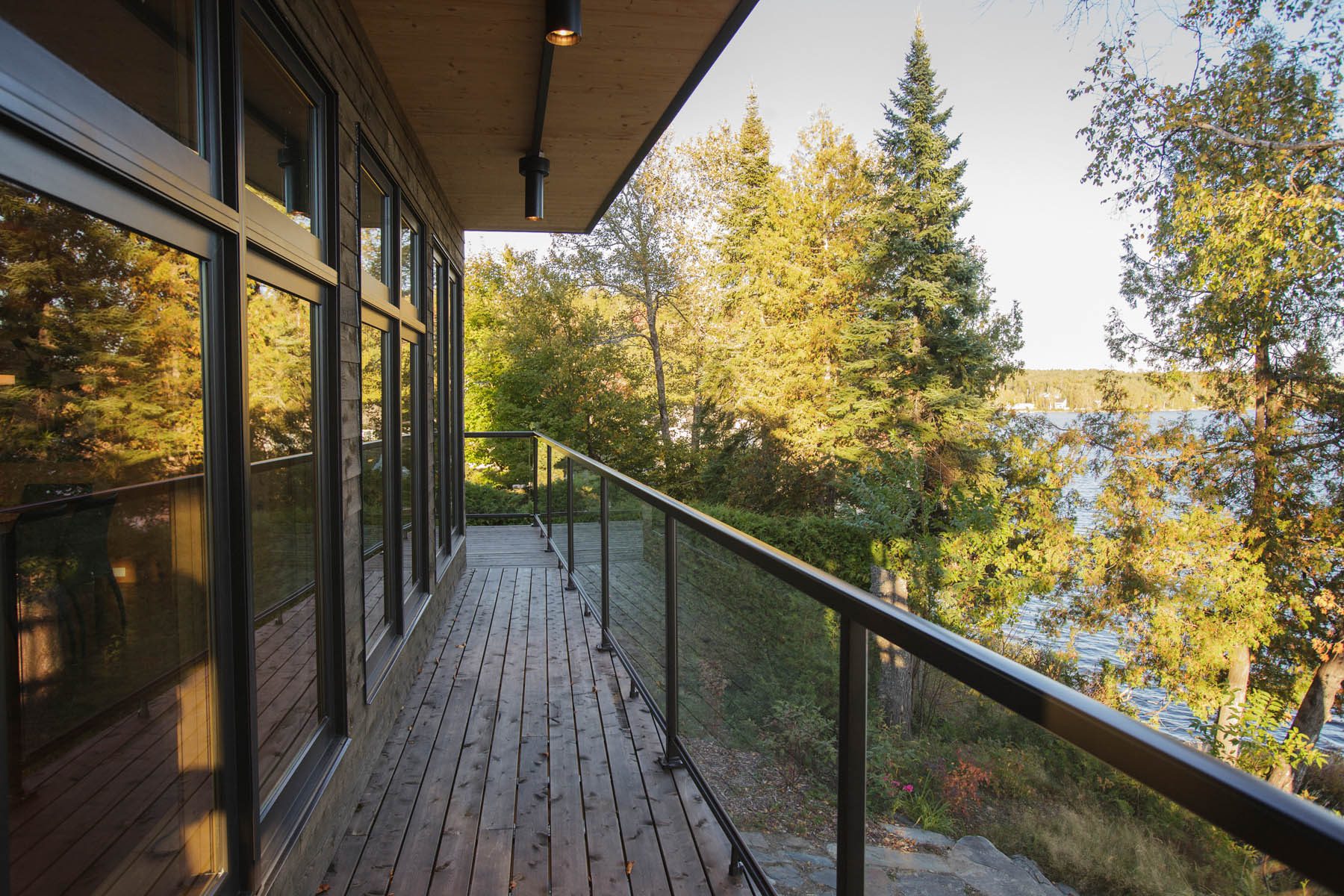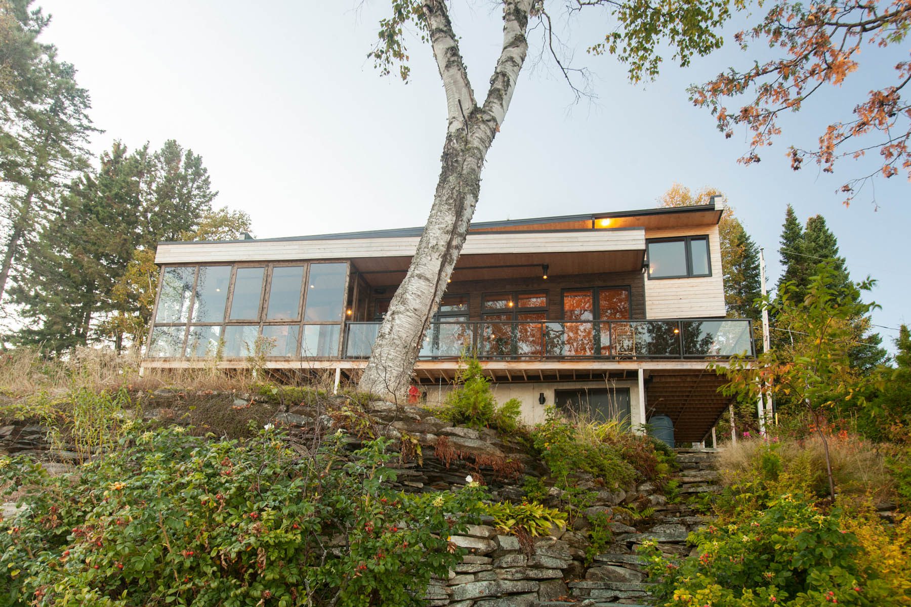TERGOS a réalisé la conception et la construction de ce projet situé au bord du Lac Etchemin. La volumétrie simple, déposée littéralement sur le roc, profite d’une implantation parallèle au lac et ouverte sur le sud. La grande façade vitrée, protégée par des débords de toits, permet un excellent apport solaire passif en hiver tout en évitant les surchauffes estivales. La résidence écologique profite aussi d’une toiture végétale, qui absorbe la chaleur et protège la membrane étanche de la toiture en prolongeant sa durée de vie. L’enveloppe valorise l’utilisation des matériaux sains, verts, naturels et durables, tout en permettant une performance énergétique supérieure.