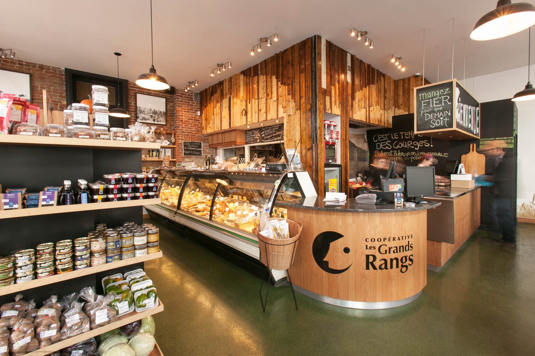 Le projet de la coopérative Les Grands Rangs (aujourd’hui connu comme la Fromagerie des Grondines) est situé au cœur du quartier Saint-Roch, à Québec, et se veut le point de rencontre entre ruralité et urbanité. Dès le départ, ce projet de rénovation a été conçu dans une optique de développement durable et de valorisation des ressources et des matériaux. Nous avons misé sur les différentes possibilités qu’offre le bois dans une optique d’aménagement commercial afin de créer une harmonie porteuse des valeurs véhiculées par notre client.