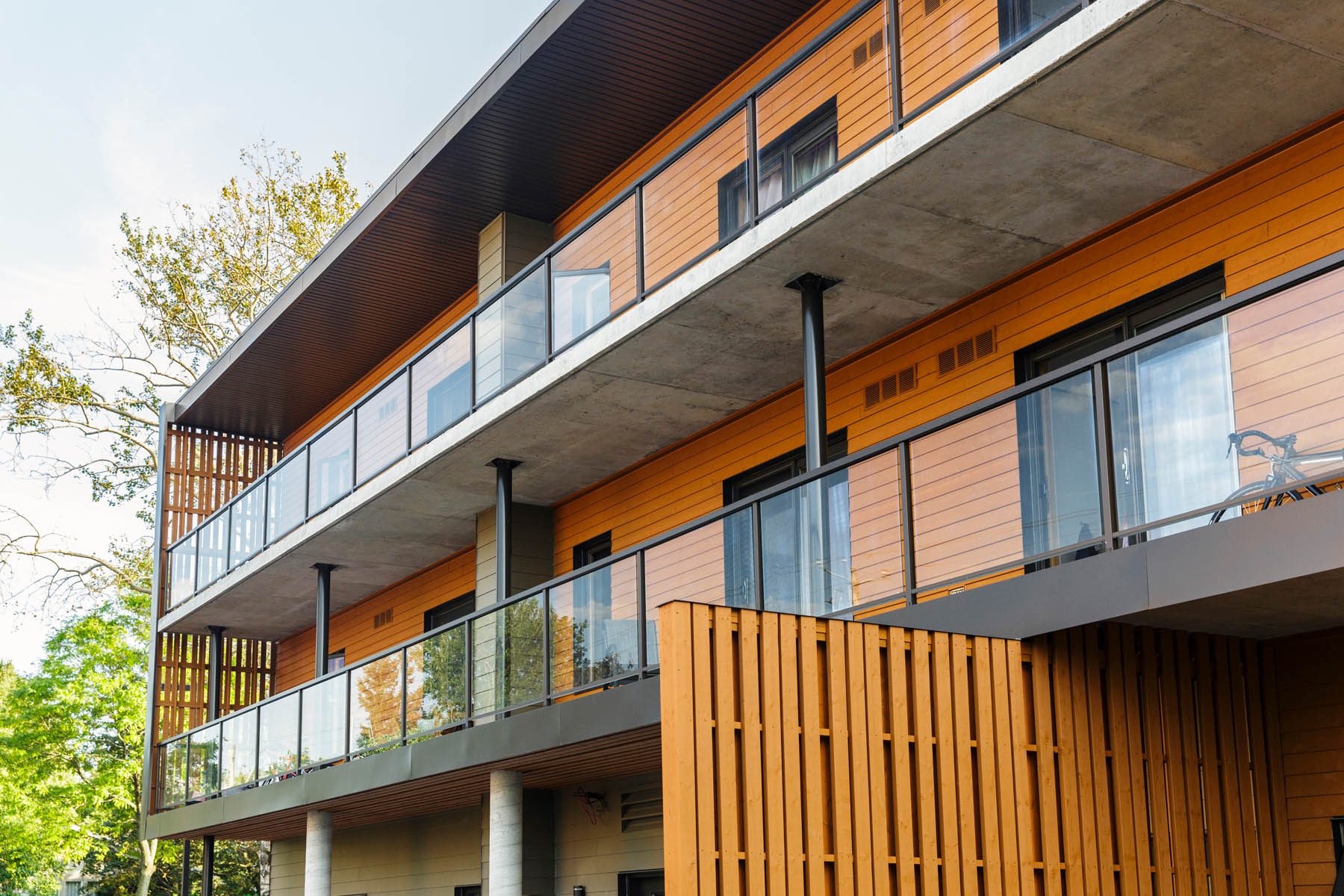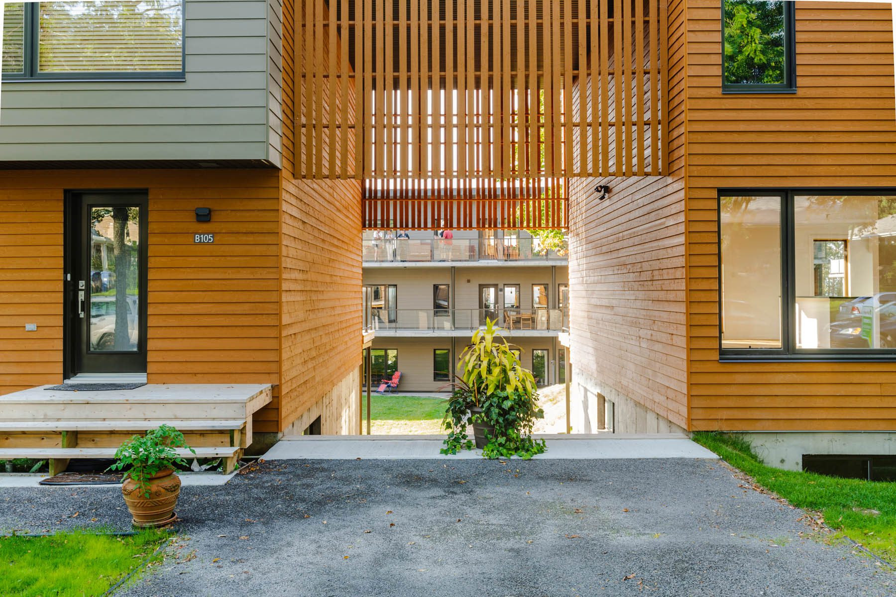 Cohabitat Québec est également porteur des valeurs écoresponsables de ses résidents. Le projet soutient ces valeurs à travers la composition architecturale, le choix des matériaux et les stratégies écologiques retenues. L’utilisation du bois était incontournable, autant pour son origine que pour ses caractéristiques responsables, saines et naturelles et son apport à l’esthétique extérieure et intérieure. Un appareillage particulier du bois, ajouré, renforce d’ailleurs le concept architectural du projet. Les composantes de l’enveloppe ont été sélectionnées en tenant compte de leur contenu recyclé, de leur efficacité énergétique, de leur contribution à la qualité de l’air, de leur provenance locale et de leur composition plus naturelle. Les détails d’assemblage entre les matériaux visent à atteindre un niveau supérieur d’efficacité énergétique en ce qui a trait au contrôle des gains et des pertes thermiques. À une autre échelle, une bonne gestion des eaux de surface est réalisée par la réduction des surfaces imperméables et par la présence d’un bassin de rétention. Enfin, la végétation et les surfaces pâles contribuent à la réduction de l’effet d’îlot de chaleur. L’ensemble des stratégies adoptées a assuré une certification LEED® pour les habitations de niveau Platine pour chacun des immeubles formant Cohabitat Québec.