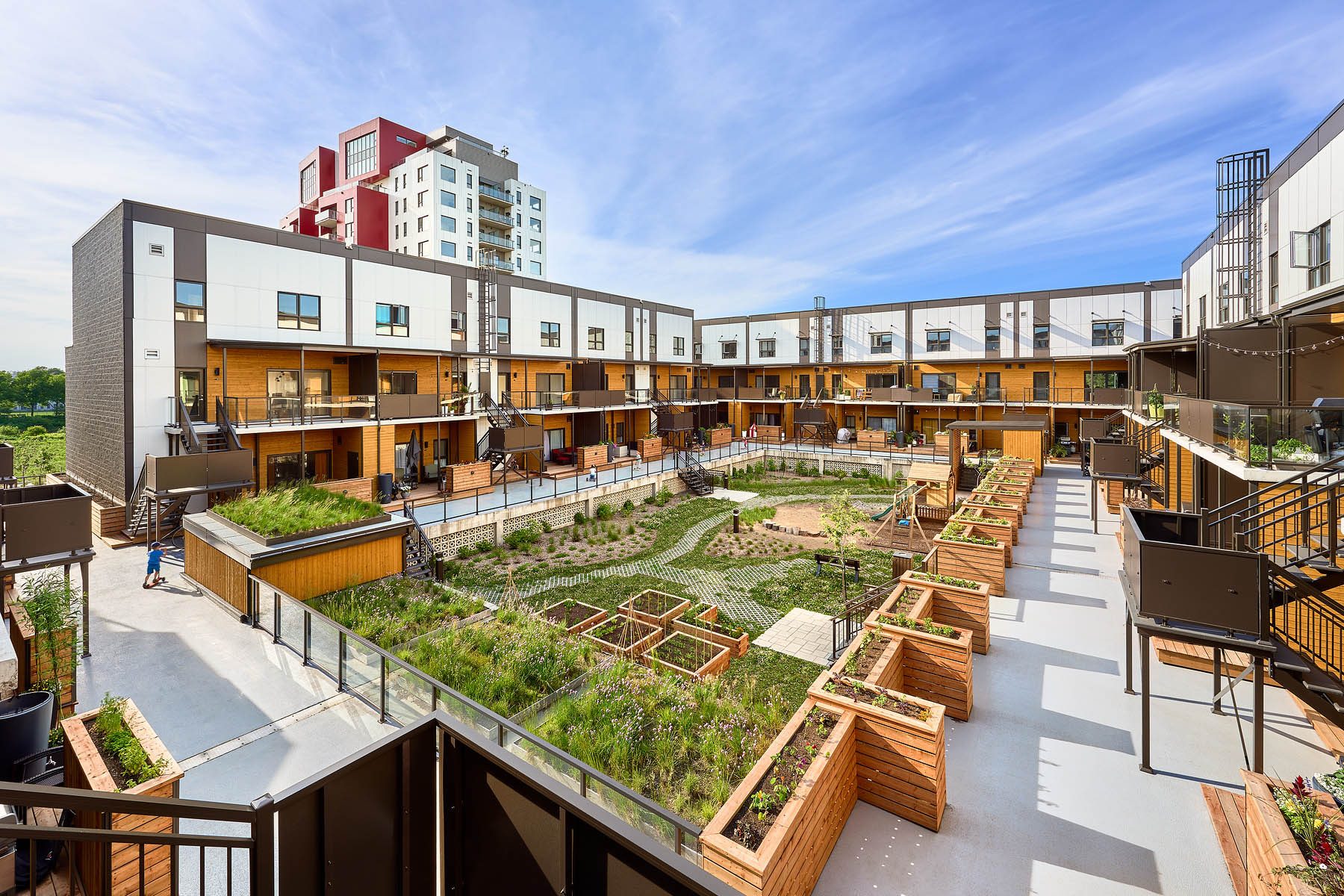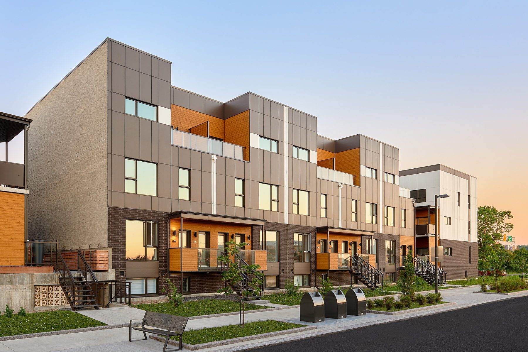 Situées dans l’écoquartier de la Pointe-aux-Lièvres, les Écopropriétés Habitus s’implantent sur une ancienne friche industrielle et la transforment en un milieu de vie durable, esthétique et verdoyant. Les 52 unités d’habitation traversantes et sur 2 étages sont réparties en 4 bâtiments orientés autour d’une cour intérieure verte et partagée. Une promenade en surplomb fait le tour de cette cour et donne accès aux habitations. C’est sous cette promenade que l’on retrouve les stationnements extérieurs couverts, qui sont donc complètement dissimulés pour laisser la place aux aménagements paysagers.