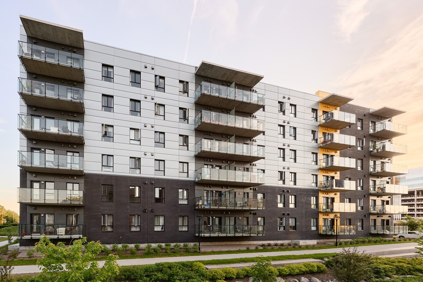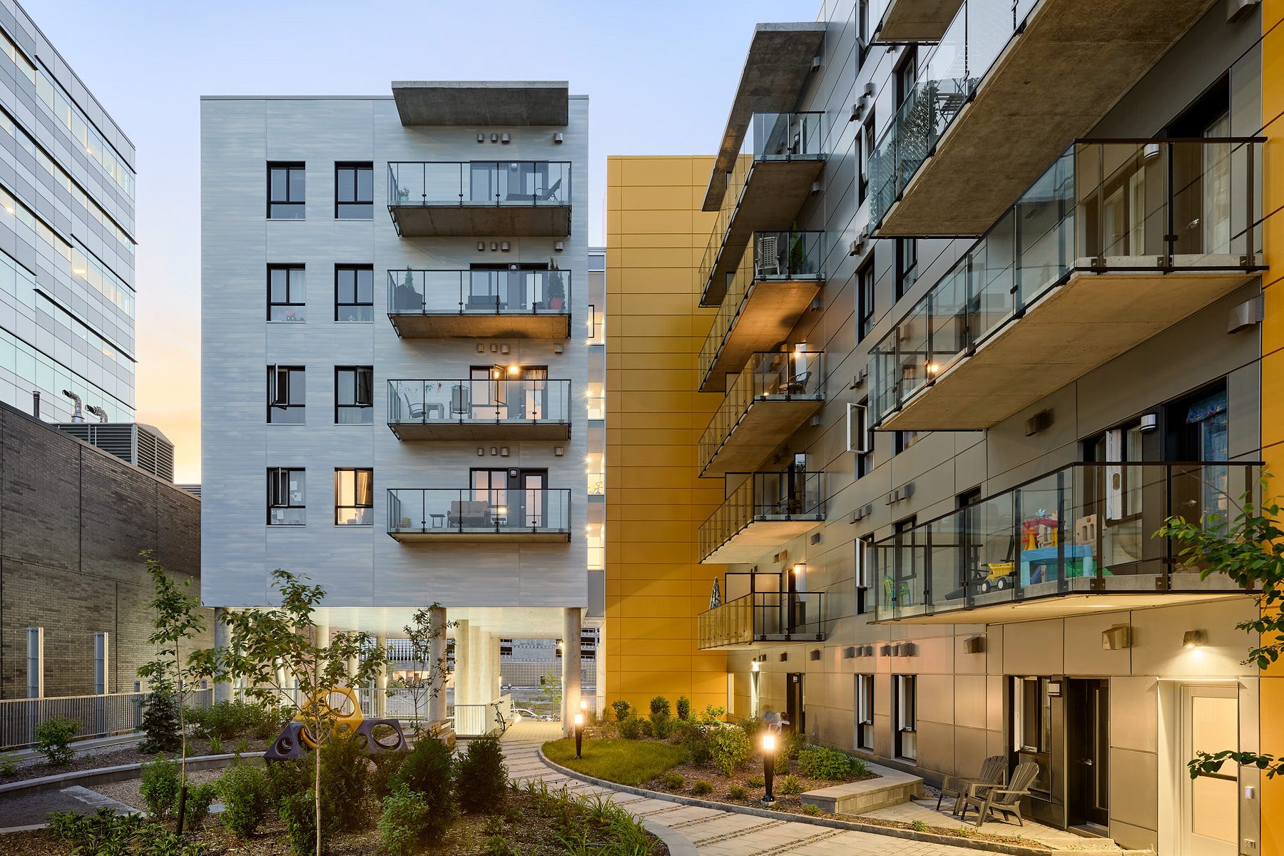 Cette forme réfléchie favorise également une ventilation naturelle des habitations et des aires communes, en assurant l’intégration d’un minimum de 40 % de logements traversants. À l’intérieur du bâtiment, la lumière naturelle et les vues sur l’environnement extérieur sont optimisées dans les espaces communs et les unités grâce à la superficie de vitrage dépassant les exigences du programme AccèsLogis.