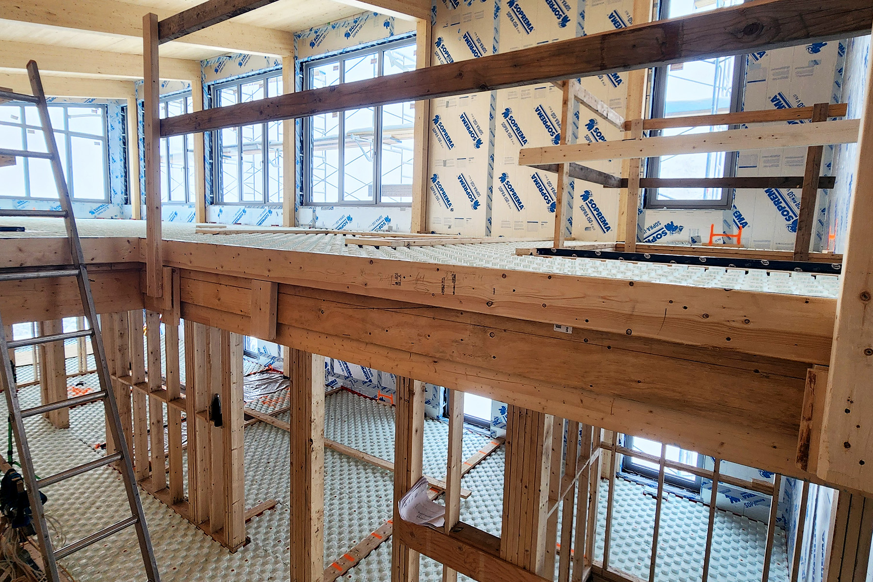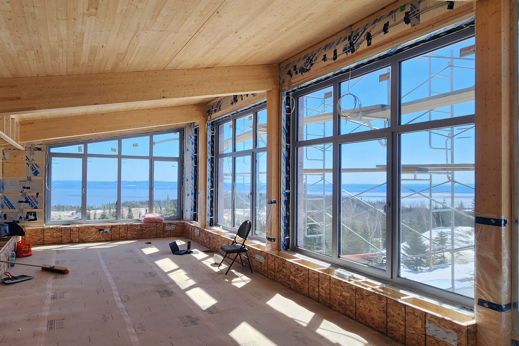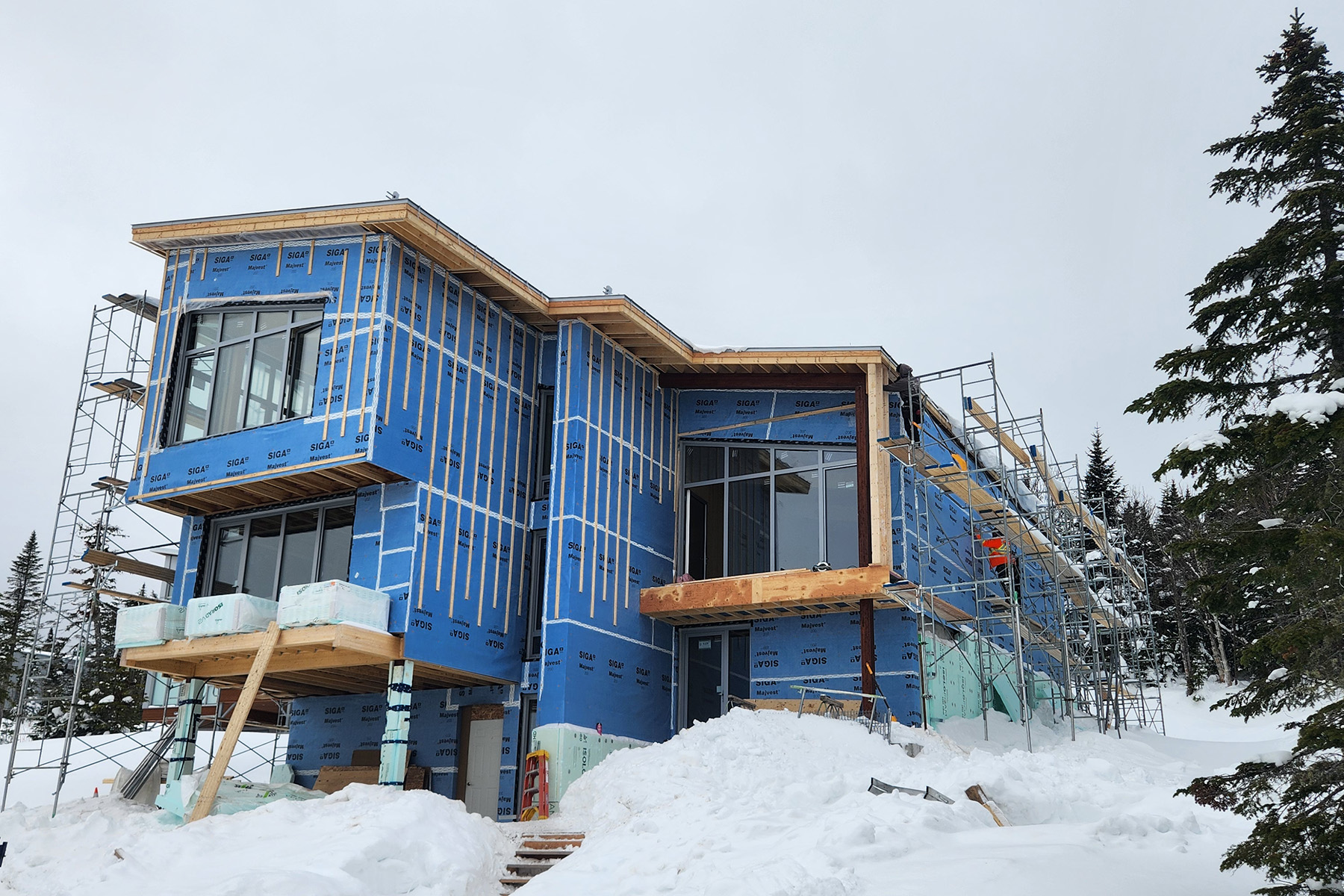 - Structure / isolation : la structure en lamellé collé / CLT, du côté intérieur, était jumelée à une ossature double 2×6 + 2×4, du côté extérieur, entrecroisé par plusieurs couches de panneaux isolants rendant l’assemblage complexe et faisant de l’élimination des ponts thermiques la principale priorité.