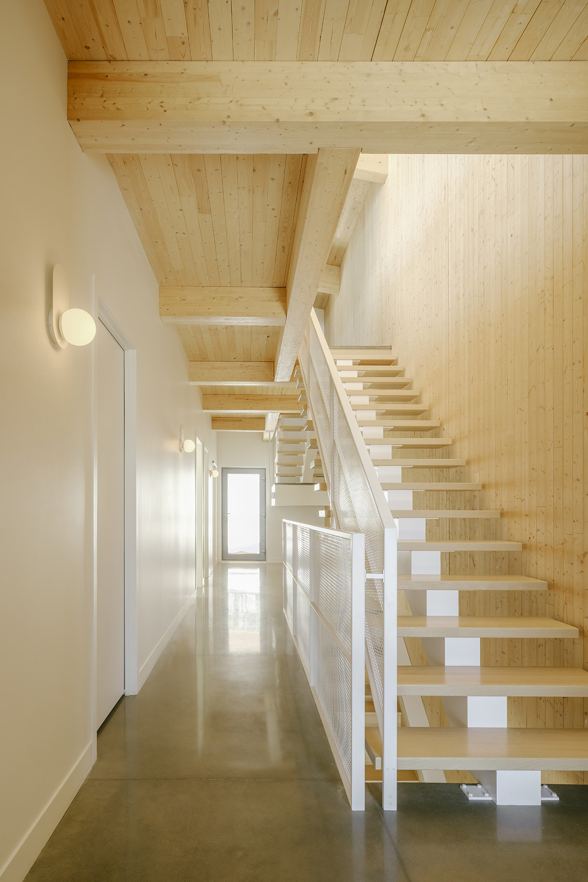 Par ailleurs, un autre objectif majeur du projet visait à mettre en valeur le bois dans sa construction. Cela s’est traduit par l’utilisation d’une structure chaleureuse en bois lamellé-collé et de panneaux de CLT apparents. L’enveloppe extérieure, réalisée en double ossature, assure une isolation supérieure, contribuant ainsi à la haute performance énergétique du bâtiment.