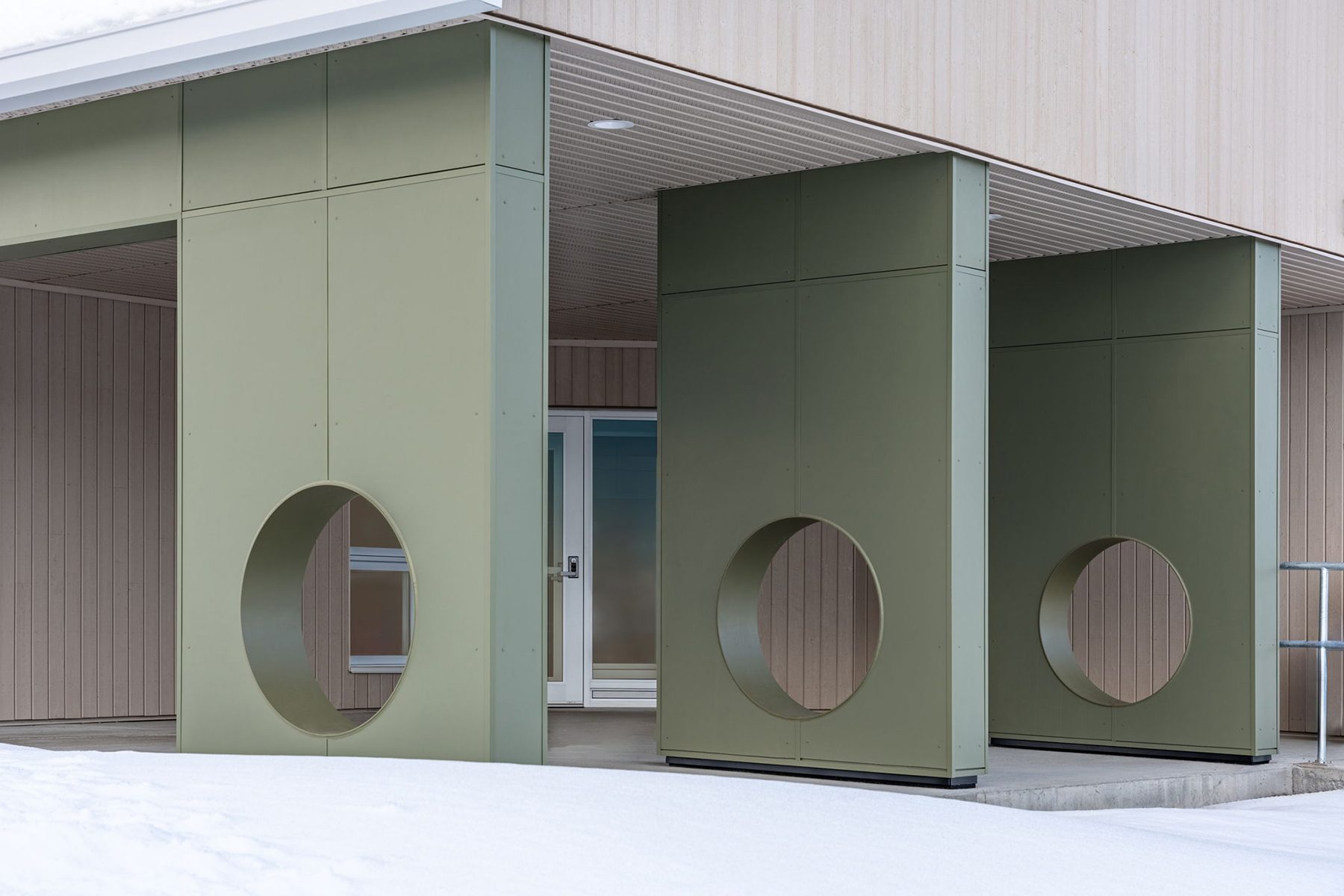 Le CPE La peluche prône une pédagogie en lien direct avec l’environnement qui l’entoure et ancrée dans le moment présent. En symbiose avec le milieu naturel, les sorties en plein air sont le fer de lance de l’approche pédagogique, valorisant ainsi le contact avec la nature, beau temps, mauvais temps. Par l’architecture du bâtiment, nous avons souhaité supporter cette approche. Le généreux porche couvert, rassurant et savamment orienté vers le soleil, permet une transition tout en douceur entre intérieur et extérieur, que ce soit pendant la rudesse de l’hiver, lors des températures caniculaires ou au moment d’un orage subit. Sous ce porche, des lames ludiques vert tendre guident les usagers et visiteurs vers l’entrée principale tout en offrant prétexte à s’y attarder quelques instants. L’accès à la cour extérieure est également protégé afin de permettre le transit de plusieurs groupes à la fois.
