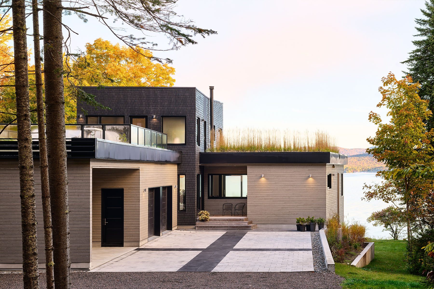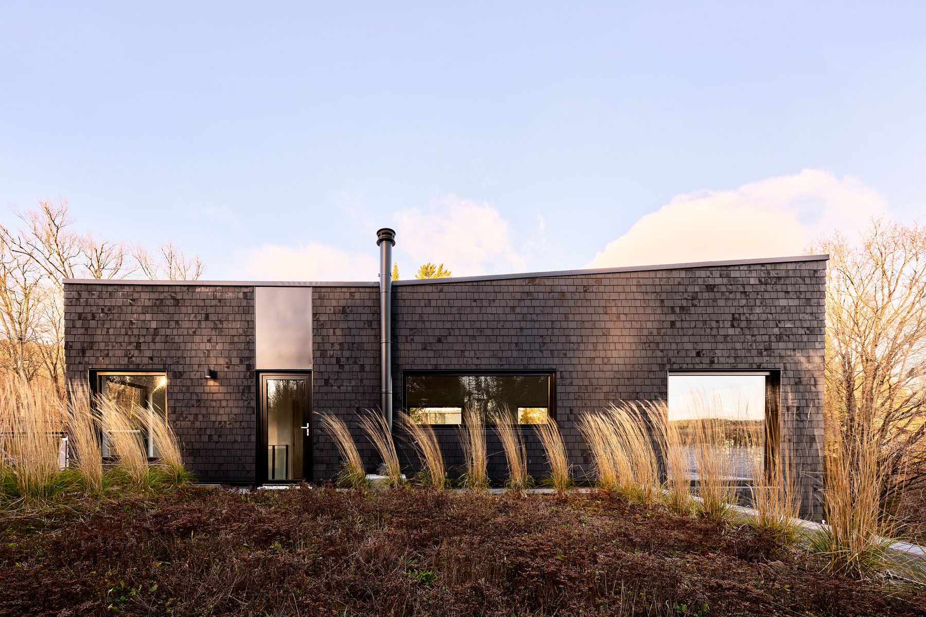 Visibles dès l’entrée, en haut du terrain, les toits végétalisés constituent un élément central du projet. Le premier toit vert accueille différentes espèces de végétations indigènes, alors que le second est destiné au jardinage. Un escalier architectural permet d’accéder à la mezzanine, un espace multifonctionnel ouvert sur les aires de vie. Quant au rez-de-jardin conçu pour les réunions familiales, il abrite un dortoir confortablement aménagé avec vue panoramique sur le lac, une vaste salle familiale et des rangements pour les équipements de plein air.