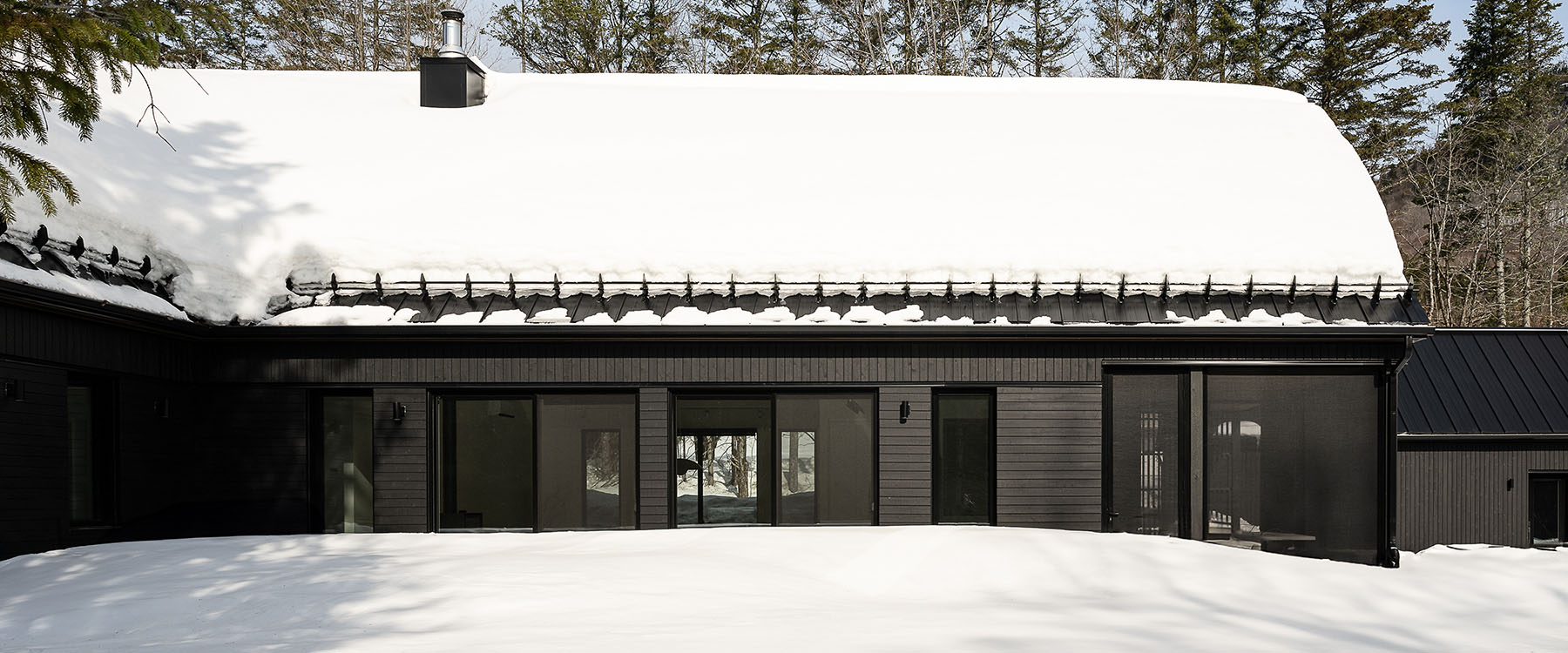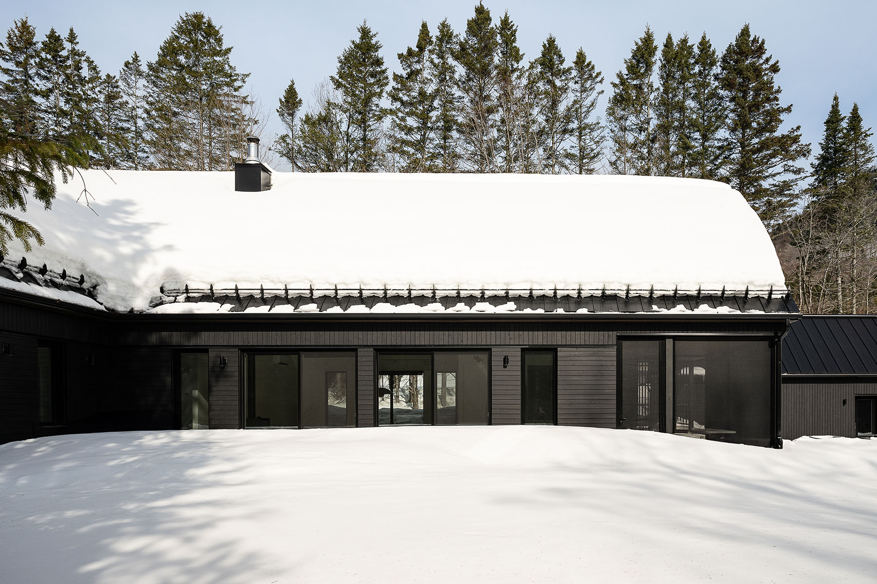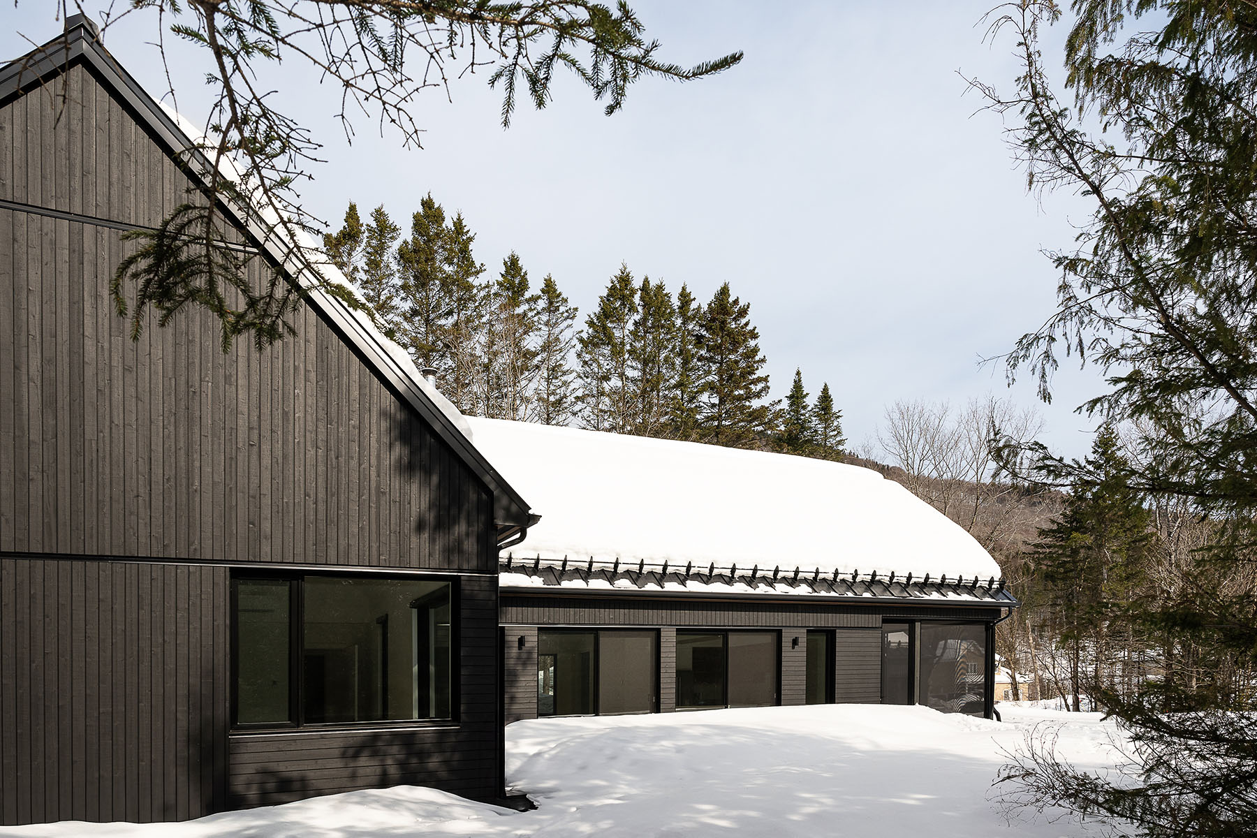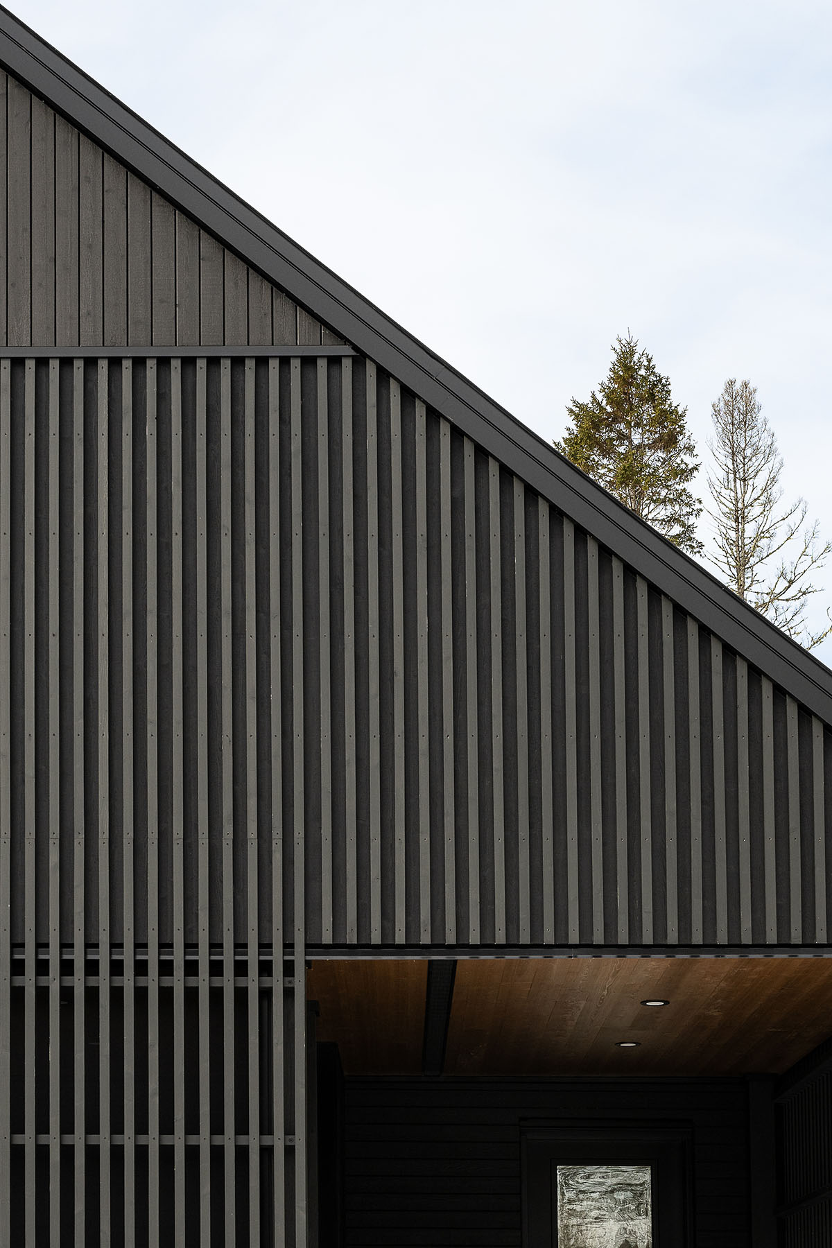 La résidence s’inscrit délicatement au pied d’un paysage montagneux, sur un vaste terrain boisé, ponctué de conifères traversé par un cours d’eau. Dissimulée derrière un écran végétal et entièrement revêtue de cèdre noir, elle intrigue dès l’approche par sa volumétrie sobre et affirmée.