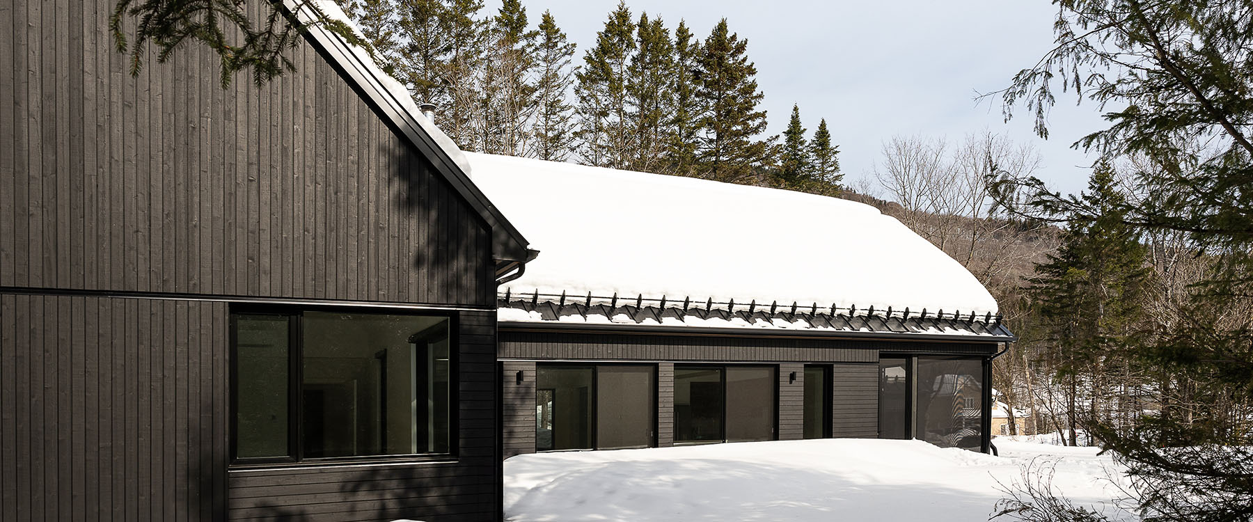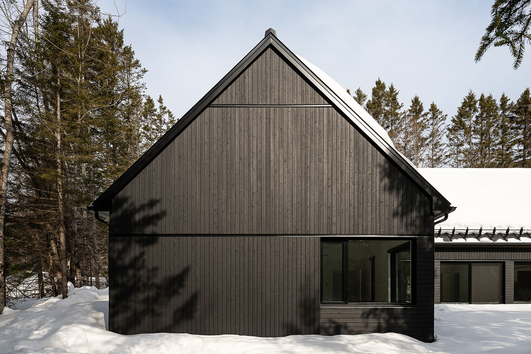 Le revêtement extérieur en cèdre noir affirme le caractère contemporain de la maison tout en permettant un travail fin sur les détails architecturaux : jeux de lattes ajourées ou en applique et transitions rythmées d’orientations horizontales et verticales. Une terrasse moustiquaire prolonge les espaces de vie et permet de profiter pleinement de l’environnement naturel, en toute saison.