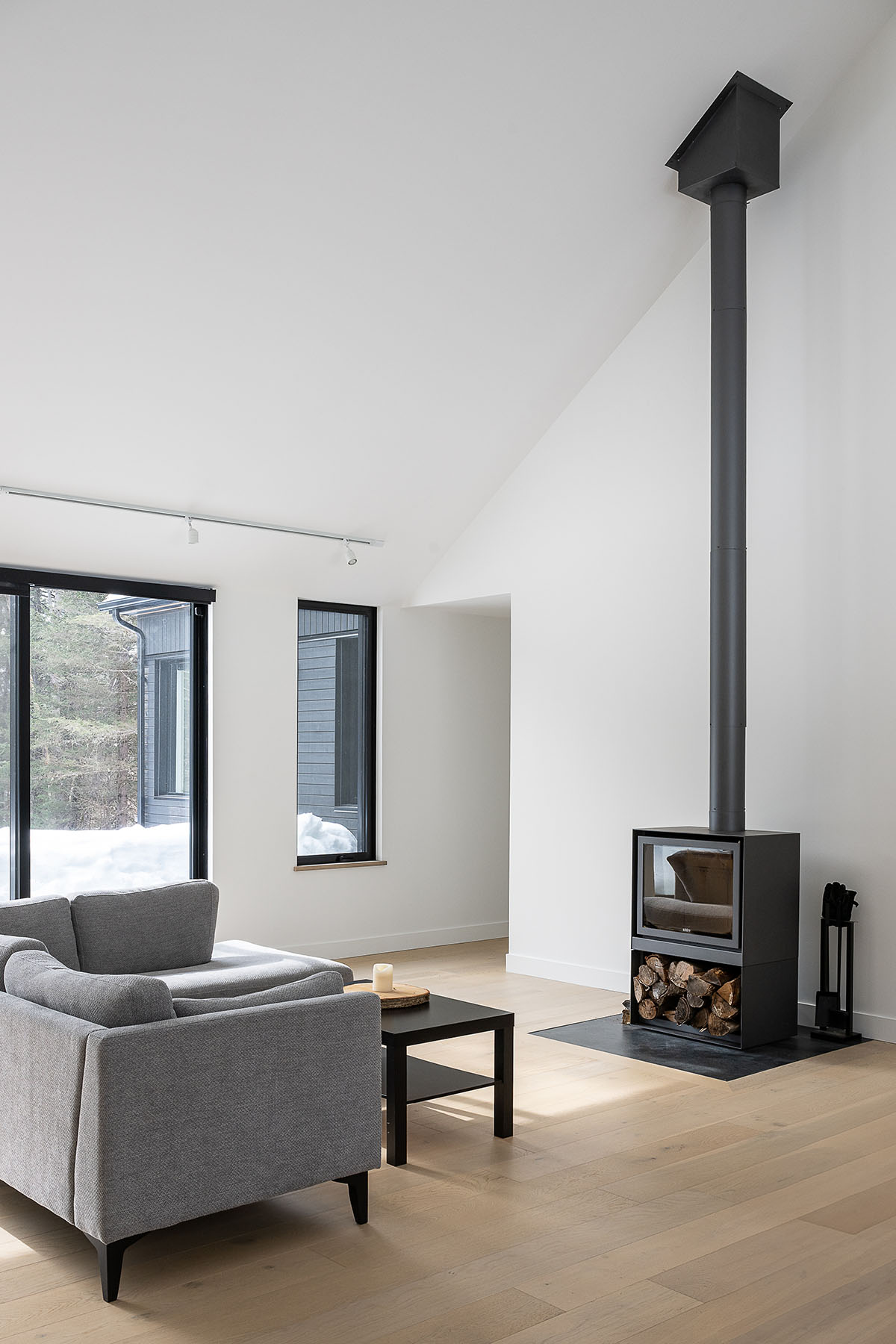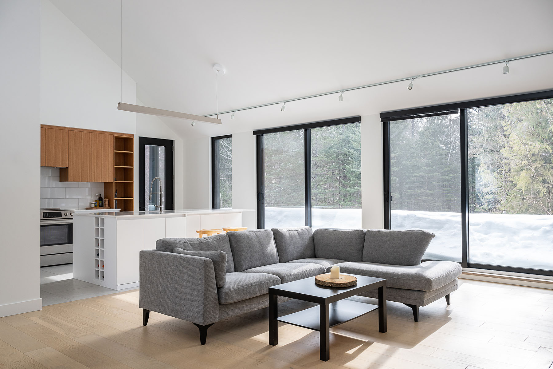 Son plan en « L » ouvert vers le sud crée un cœur de maison baigné de lumière naturelle et maximise les gains solaires passifs. Les espaces de vie s’organisent autour d’une terrasse arrière centrale, favorisant une relation constante entre intérieur et extérieur. Dès l’entrée, le plafond cathédral des aires de vie accentue la sensation d’ouverture et de générosité des volumes, ce qui favorise le confort et la qualité de vie au quotidien.