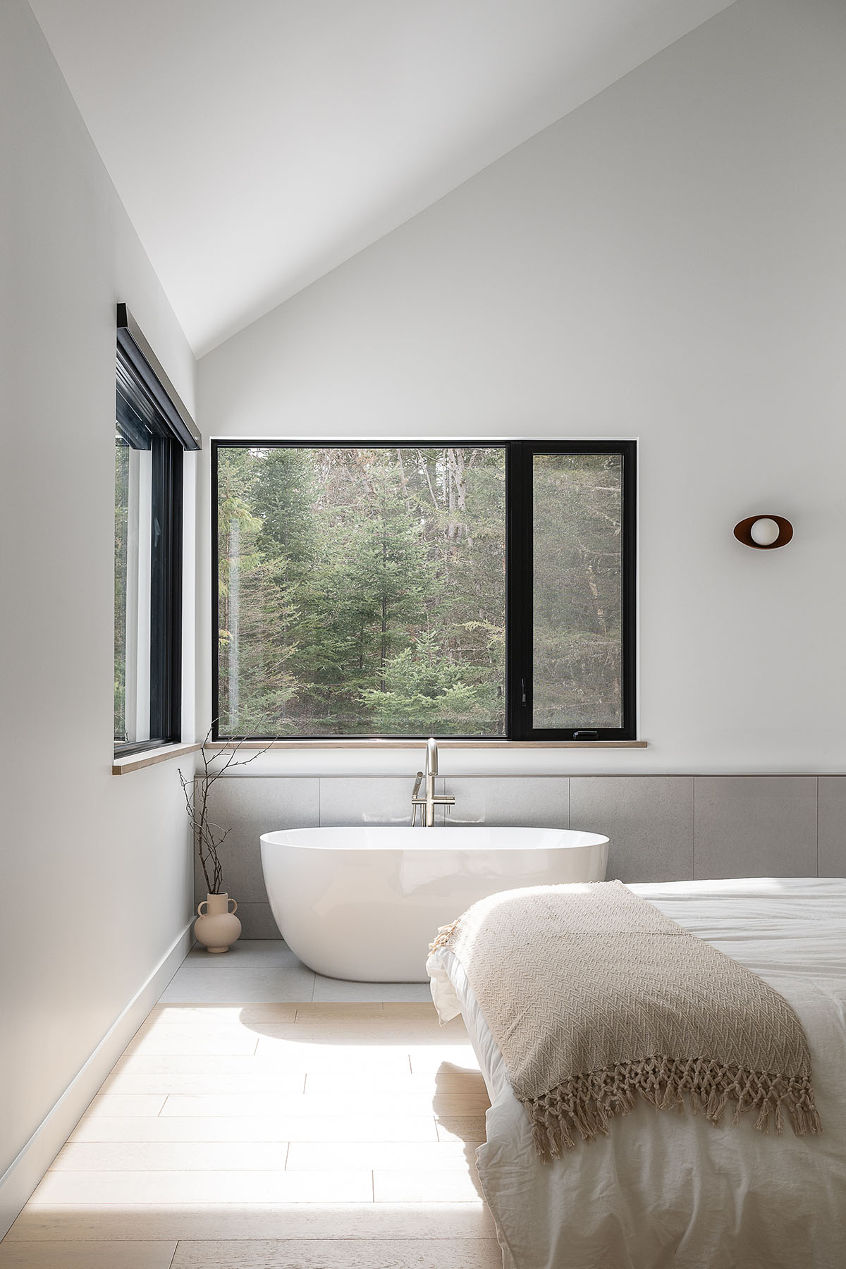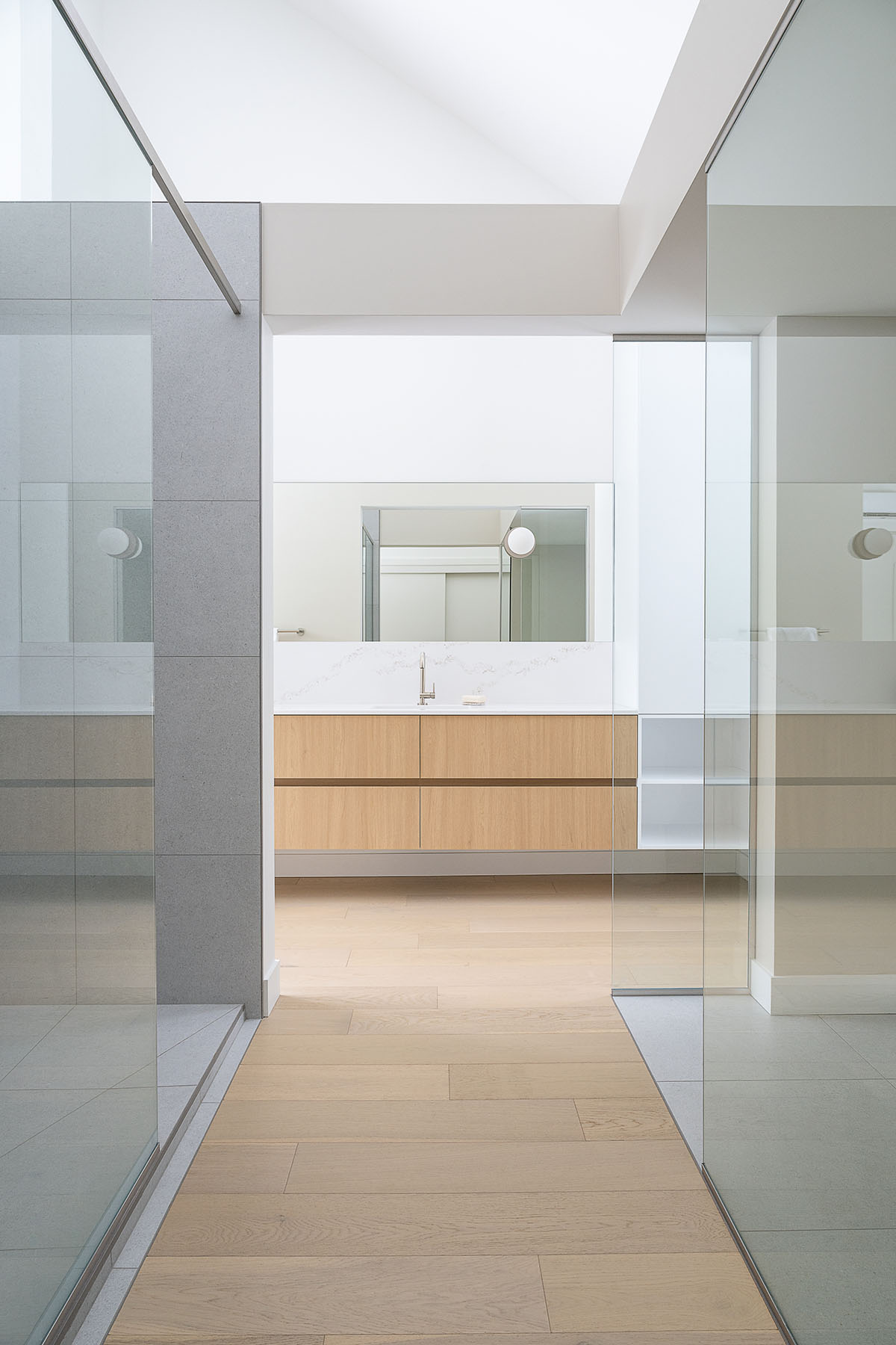 Conçue sur un seul niveau dans un souci d’accessibilité à long terme, la maison répond précisément aux besoins présents et futurs des propriétaires. Une pièce multifonctionnelle peut tour à tour devenir atelier, bureau ou chambre d’invités, offrant une grande flexibilité d’usage tout en limitant l’empreinte en pieds carrés. L’aile sud accueille la suite des maîtres, avec salle de bain intégrée, dans une atmosphère intime et apaisante.