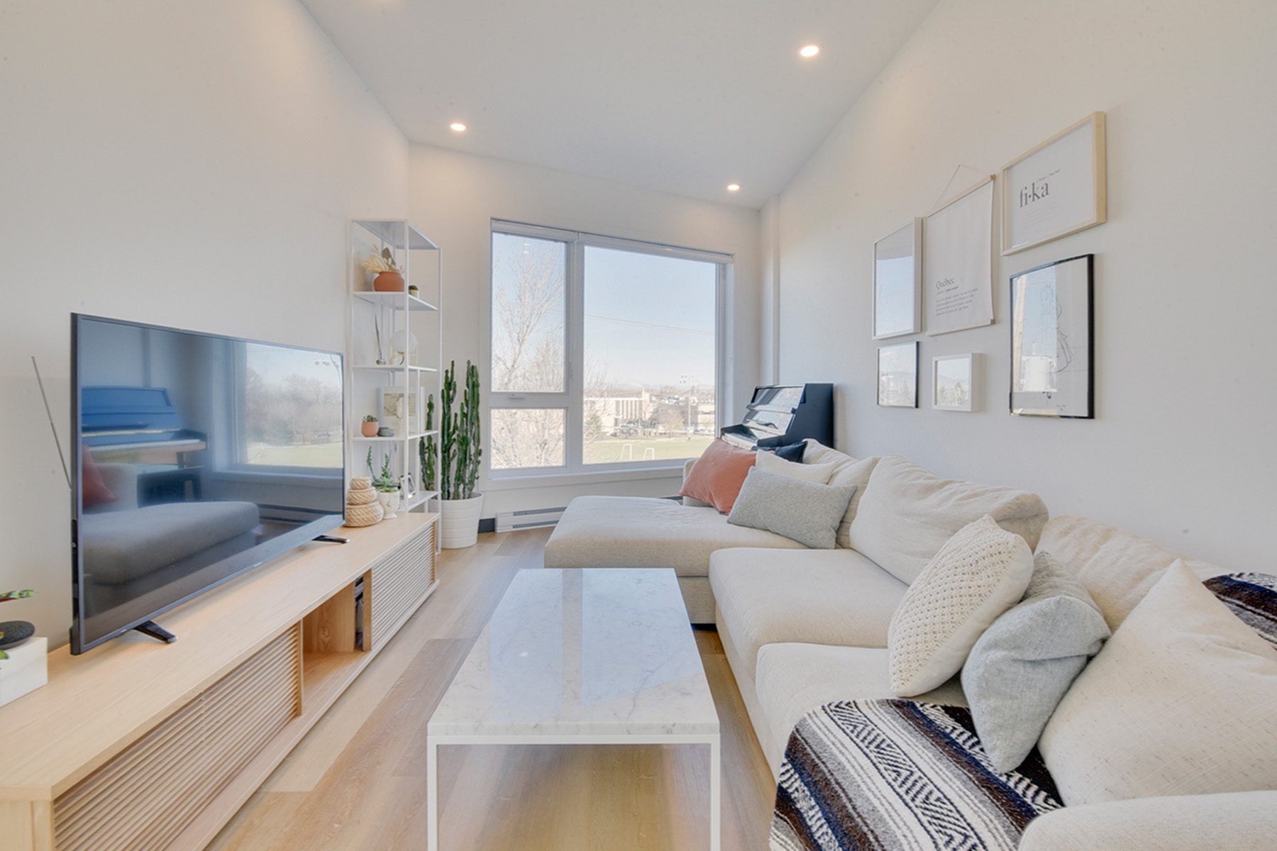 Malgré des contraintes de site hors du commun, ce volume atypique se traduit en unités résidentielles empreintes de lumière naturelle avec un horizon verdoyant. Les six unités sont toutes traversantes et sur deux niveaux. Elles offrent aussi une vue à 180 degrés sur le parc. À l’arrière, la façade bénéficie probablement de la seule orientation franc sud du quartier Saint-Sauveur.